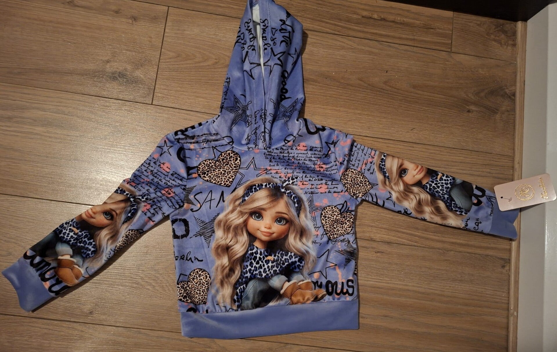 De set bestaat uit een heerlijk zachte joggingsbroek met bijpassende hoodie, beiden in een mooie paarse tint. De hoodie is versierd met een vrolijke poppenprint en speelse details die de outfit nét dat beetje extra geven.